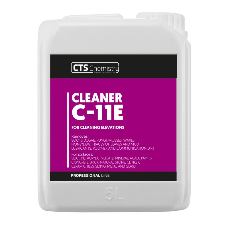 ELEVATIONS CLEANER | C-11E is an alkaline substance based on selected organic and inorganic additives to remove long-term mineral and organic dirt of fatty origin, soot, algae, fungi, moss, wax, honeydew, leaf traces and mud.